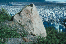 Glacial ice entrains debris of varying sizes from small particles to extremely large masses of rock. This debris is transported to the coast by glacier ice and released during the production, drift and melting of icebergs. The rate of debris release by ice depends upon the size of the ice mass in which it is carried as well as the temperature of the ocean through which the ice floe passes.[7][8]