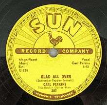 "Glad All Over" is a 1957 song recorded by rock and roll and rockabilly artist Carl Perkins, "The Rockin' Guitar Man", at Sun Records in 1957.[1] It was released as a 45 and 78 single, Sun 287, on January 6, 1958 (b/w "Lend Me Your Comb").[2] It was written by Aaron Schroeder, Sid Tepper, and Roy Bennett.