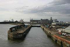 Gladstone Dock lock entrance is one of the two remaining operational river entrances in the northern dock system. Measuring 1,070 ft (330 m) long and 130 ft (40 m) wide, wider and longer than the Panama Canal locks, it provides maritime access to the container terminal of Royal Seaforth Dock, which opened in 1972.[2][1]