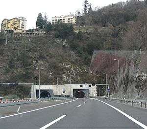 The Glion Tunnel is a two-gallery vehicular tunnel running underneath Montreux in Switzerland. It carries autoroute A9, which links the Vaud canton to the Valais, and was placed in service in November 1970. The tunnel is 1,350 metres (4,430 ft) long, 9 metres (30 ft) wide and 7.5 metres (25 ft) high.