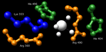 Essential residues in the active site of vanadium haloperoxidases include: Lys353, Arg360, Arg490, His404, and His496. Corresponding residues in the active site of glucose-6-phosphatase-α include Arg170 and Arg83, which donate hydrogen ions to the phosphate, stabilizing the transition state, His119, which provides a proton to the dephosphorylated oxygen attached to glucose, and His176, which completes a nucleophilic attack on the phosphate to form a covalently bound phosphoryl enzyme intermediate.[1] Within the Vanadium-containing chloroperoxidase, Lys353 was found to stabilize the phosphate in the transition state. However, the corresponding residue in glucose-6-phosphatase-α (Lys76) resides within the ER membrane and its function, if any, is currently undetermined. With the exception of Lys76, these residues are all located on the luminal side of the ER membrane.[4]