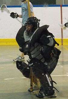 Goaltending in box lacrosse tends to be more like goaltending in ice hockey than field lacrosse.[27] The box goalie's stance is similar to an ice hockey goalie. The goalie crouched, but with his knees spread, not pinched like in ice hockey. Heels shoulder-width apart, toes generally pointed on an outward angle to allow for stepping into the shot. One hand sits on top of the thigh, holding the goal stick in a position to cover the five-hole (the area between the legs) and the other hand is resting or propped out in the vicinity between the waistline and the outside of the upper thigh. The elbow is propped out, ready to swing out towards a high shot.[28][29]