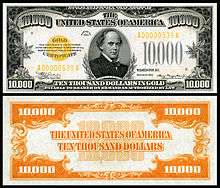 Notes from this first issue are extremely rare in lower ($20 and $100) denominations. A single $1,000 and $5,000 are reported to exist in a government collection, and an issued $500 or $10,000 has never been seen.[5] In addition to the two engraved signatures customary on United States banknotes (the Register of the Treasury and Treasurer of the United States), the earlier issues of Gold certificates (i.e., 1865, 1870, 1875, and some 1882) included a third signature of one of the Assistant Treasurers of the United States (in New York or Washington, D.C.).[6] Known as a countersigned or triple-signature note, this feature existed for all Series prior to 1882 (and the first printing of the Series 1882). |