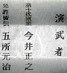 - ↑ Gosho Motoharu, Imai Massayuke (1981). Niten Ichi Ryu Demonstration for the permanent archive of Nihon Kobudo Kyokai (video). Japan: Nippon Budokan.