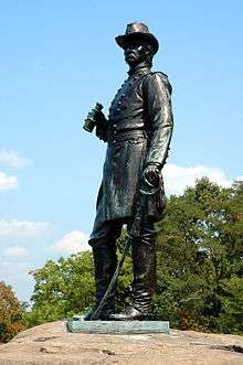 A bronze statue of Warren stands on Little Round Top in Gettysburg National Military Park. It was created by Karl Gerhardt (1853–1940) and dedicated in 1888.[13] Another bronze statue, by Henry Baerer (1837–1908), was erected in the Grand Army Plaza, Brooklyn, New York. It depicts Warren standing in uniform, with field binoculars on a granite pedestal, made of stone quarried at Little Round Top.[2]