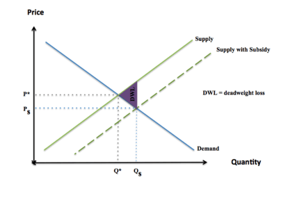 Assuming the market is in a perfectly competitive equilibrium, a subsidy increases the supply of the good beyond the equilibrium competitive quantity. The imbalance creates deadweight loss. Deadweight loss from a subsidy is the amount by which the cost of the subsidy exceeds the gains of the subsidy.[14] The magnitude of the deadweight loss is dependent on the size of the subsidy. This is considered a market failure, or inefficiency.[14]