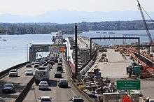 In 2011, WSDOT broke ground on the replacement bridge.[13] On April 2, 2016, WSDOT held a grand opening ceremony, allowing the public to explore the top deck of the new bridge on the westbound side.[14] The replacement bridge opened to westbound traffic on April 11, 2016, and opened to eastbound traffic on April 25, 2016.[15] The old bridge was permanently closed at 23:00 PDT on April 22, 2016, with demolition expected to be completed by the end of 2016.