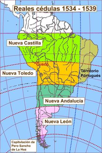 - ↑ For two, somewhat different interpretations of the boundaries in unsettled areas, see Burkholder, Mark A. and Lyman L. Johnson. Colonial Latin America (10 editions). (New York: Oxford University Press, 1990), Map 2, 73 ISBN 0-19-506110-1; and Lombardi, Cathryn L., John V. Lombardi and K. Lynn Stoner. Latin American History: A Teaching Atlas. (Madison: The University of Wisconsin Press, 1983), 29. ISBN 0-299-09714-5