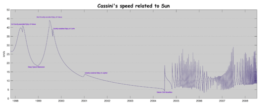 In orbital mechanics and aerospace engineering, a gravitational slingshot, gravity assist maneuver, or swing-by is the use of the relative movement (e.g. orbit around the Sun) and gravity of a planet or other astronomical object to alter the path and speed of a spacecraft, typically in order to save propellant, time, and expense. Gravity assistance can be used to accelerate a spacecraft, that is, to increase or decrease its speed and/or redirect its path. The "assist" is provided by the motion of the gravitating body as it pulls on the spacecraft.[1] It was used by interplanetary probes from Mariner 10 onwards, including the two Voyager probes' notable flybys of Jupiter and Saturn.