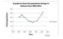 This population graph shows an overall increase over 130 years from 1881–2011 in terms of the number of residents that have moved into the village of Edstone. However, the most noticeable difference being within a 50-year time period, from 1961 where the population rapidly increased from 113 residents to 217 residents in 2011 (Census data) an overall increase of 105 inhabitants. Although, prior to the 1961 population of Edstone, the general trend saw the population decrease by 89 residents from 1821 to 1921.[1][10]