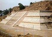 Exploration of the pyramid itself began in 1931 under architect Ignacio Marquina who dug tunnels to explore the substructures. This was a time of political instability in Mexico, mostly due to the Cristero War. However, the decision was made to excavate the structure because of the success of the excavations of Teotihuacan by Manuel Gamio in the 1920s.[22] The project was given to Marquina because of his experience working with Gamio in Teotihuacan. While credit is given to Marquina, he spent little time at the site. Most of the work was really done by Marino Gómez, the site guardian, who directed the digging of the tunnels. These tunnels allowed for the mapping and modelling of the pyramid's successive layers.[23] The pyramid had no obvious entrance, due to its deteriorated condition, but it was decided to begin tunnelling on the north side, where colonial construction had damaged it. On this side, the remains of walls and other structures could be seen. Tunnelling techniques were based on various team members' experience at Teotihuacan and Tenayuca. These techniques were based on mining, even using small tracks and miniature coal cars to carry out debris. Examples of these are at the site museum. The base of the pyramid was constructed of sun-dried adobe bricks, which contained ceramic, obsidian and gravel for better compacting. This solid foundation allowed the excavators to only need to create "false arches," like those found in Mayan constructions, rather than adding beams and other supports. The first two tunnels were built to Cris-cross the centre, one north/south and the other east/west.When the tunnels reached substructure, they then followed the contour of the structure, and eventually the various tunnels created an underground labyrinth. By 1939, there were four km of tunnels, with two more added by 1951.[24] The tunnels demonstrate the real value of the pyramid, which is not visible on the surface.[25]