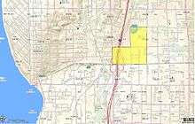 From historical photographs and descriptions, the mill was built on the east side of Forbes Lake, between the lake and present-day 124th Avenue Northeast in Kirkland.[25][lower-alpha 2] Historical society documents state that foundations and other remnants of the mill are reported to exist in the vicinity of the Kirkland Costco warehouse (or the nearby Rose Hill Presbyterian Church[27]), but could not be found. The same location was noted in a Seattle Times article on Kirkland's centennial in 2005.[28] The property owned by Great Western is shown in the map to the right, roughly bounded on the south by NE 85th Street, on the north by modern day Forbes Lake Park, on the west by 116th Avenue NE, and on the east by 124th Avenue NE.[29]