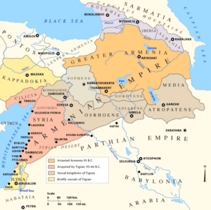 To the Romans it was known as Armenia Maior and to the Greek-speaking peoples as Ἀρμενία Μεγάλη (Armenia Megale), to differentiate it with Lesser Armenia (Pok'r Hayk′, in Latin Armenia Minor).[1] It would later be used to distinguish it from the medieval kingdom that was established in Cilicia, which was sometimes referred to as Little Armenia (not to be confused with Lesser Armenia). Though its borders were in a constant state of flux, Greater Armenia roughly encompassed the area stretching from the Euphrates River in the west, the region of Artsakh and parts of Iranian Azerbaijan to the east, parts of the modern state of Georgia to the north, with its southern boundary abutting the northern tip of Mesopotamia.
