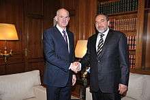 Relations between Greece and Israel improved since 1995 due to the decline of Israeli-Turkish relations under the AK Party of prime minister Erdoğan, Greece's desire to increase its deterrent power against Turkey, the death of Papandreou in June 1996, and the improvement in U.S.-Greece relations.[12] In 2006, President Moshe Katsav visited Greece, in what was the first official visit by an Israeli head of state.[5][13] Greece–Israel relations improved as Turkish-Israel relations worsened in the aftermath of the Gaza flotilla raid in May 2010. In July 2010 Greek Prime minister George Papandreou (son of Andreas Papandreou) made an official visit to Israel after many years, in order to improve bilateral relations between the two countries.[14] During Netanyahu's reciprocal visit in August 2010, the leaders of the two states discussed the Israeli-Palestinian conflict, Iran, and military and economic cooperation in a one-on-one meeting that lasted an hour and a half.[15] In January 2011 Foreign Minister of Israel Avigdor Liberman made a state visit to Athens. During that visit, the two countries reportedly set up a joint committee to study ways of improving cooperation on strategic and anti-terror issues.[16][17]