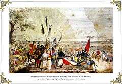 It would take until the end of the century for the city's Greek community to recover.[78] The revolt, however, gained momentum in Mount Athos and Kassandra, and the island of Thasos joined it.[79] Meanwhile, the revolt in Chalkidiki was progressing slowly and unsystematically. In June 1821 the insurgents tried to cut communications between Thrace and the south, attempting to prevent the serasker Hadji Mehmet Bayram Pasha from transferring forces from Asia Minor to southern Greece. Even though the rebels delayed him, they were ultimately defeated at the pass of Rentina.[80]
