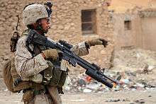 The United States Army rifle squad consists of two fireteams of four soldiers each, with the designated grenadier being equipped with an M4/M16 with the M203 grenade launcher (or newer M320) slung under the barrel and providing limited high-angle fire over 'dead space'.[25]
