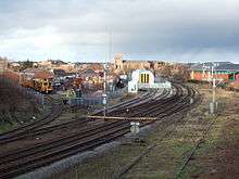 The Welsh Marches Line (and Cambrian Line) runs through the area, partially on a long brick viaduct which crosses over the Abbey Foregate road, between Severn Bridge Junction and Sutton Bridge Junction. There were once extensive engine sheds and other railway related activities in the area. There remains a permanent way depot - Coleham Depot - and in 2008 a new inspection shed for the Class 97/3 locomotives was built.