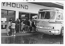 In 1955, the Interstate Commerce Commission ruled in the case of Keys v. Carolina Coach Co. that U.S. interstate bus operations, such as Greyhound's, could not be segregated by race.[22] In 1960, in the case of Boynton v. Virginia, the U.S. Supreme Court found that an African American had been wrongly convicted of trespassing in a "whites only" terminal area.[23] In May 1961, civil rights activists organized interracial Freedom Rides as proof of the desegregation rulings. On May 14, a mob attacked pair of buses (a Greyhound and a Trailways) traveling from Washington, D.C., to New Orleans, Louisiana, and slashed the Greyhound bus's tires.[24] Several miles outside of Anniston, Alabama, the mob forced the Greyhound bus to stop, broke its windows, and firebombed it.[25][26] The mob held the bus' doors shut, intending to burn the riders to death. Sources disagree, but either an exploding fuel tank[25] or an undercover state investigator brandishing a revolver[27] caused the mob to retreat. When the riders escaped the bus, the mob beat them, while warning shots fired into the air by highway patrolmen prevented them from being lynched.[25] Title II and Title III of the Civil Rights Act of 1964 broadened protections beyond federally regulated carriers such as Greyhound, to include non-discrimination in hotels, restaurants, and other public accommodations, as well as state and local government buildings.[28]