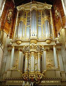 The two organs are world-famous. The smaller one, called the "Koororgel", was built in 1511 by Jan van Covelens, and is built against the North wall of the church.[2] It is the oldest playable organ in the Netherlands. The larger organ at the west end of the church is one of the most famous, significant and beautiful organs in the world. It was built by Jacobus Caltus van Hagerbeer, finished in 1645. The magnificent casework, which unusually stretches from floor to vault and makes the organ part of the architecture of the church, was designed by Jacob van Campen, a leading architect of the time. The enormous canvas shutters were painted by Caesar van Everdingen.[2] The organ was rebuilt in 1723 by Frans Caspar Schnitger.[2] He left the casework much as it was, but created an organ in the North German style within the old case. He reused much of the old fluework, but all the mixtures and reeds were new. The organ has not been changed much since then, and is rare in that 90 percent of the original material, pipework, action, soundboards, case, survives. As such it is one of the most important organs in the world. It is the subject of a documentary made in 2013 and released on DVD by Fugue State Films as "Alkmaar: The Organs of the Laurenskerk".