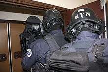 - ↑ Each of the two French national police forces, the National Police and the National Gendarmerie has primary responsibility for a part of the territory: large cities and urban areas for the National Police, smaller cities and rural areas for the National Gendarmerie. There are two National Police units specialized in counter-terrorism and hostage rescue: the Paris Research and Intervention Brigade and RAID. Together they form a task force called National Police Intervention Force (French: Force d'intervention de la Police nationale or FIPN). GIGN and FIPN (or its components) can be engaged together – or in the other force's area of responsibility – in an emergency.