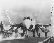 Following the good showing of the propeller-driven AD-6/7 Skyraider in the Korean War, the United States Navy issued preliminary requirements in 1955 for an all-weather carrier-based attack aircraft. The U.S. Navy published an operational requirement document for it in October 1956. It released a request for proposals (RFP) in February 1957.[1] Proposals were submitted by Bell, Boeing, Douglas, Grumman, Lockheed, Martin, North American, and Vought.[2] Following evaluation of the bids, the U.S. Navy announced the selection of Grumman on 2 January 1958. The company was awarded a contract for the development of the A2F-1 in February 1958.[3] The A-6's design team was led by Lawrence Mead, Jr. He later played a lead role in the design of the Grumman F-14 Tomcat and the Lunar Excursion Module.[4]