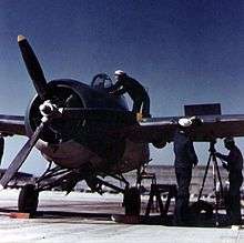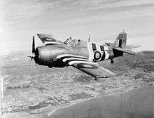 General Motors / Eastern Aircraft produced 5,280 FM variants of the Wildcat.[2] Grumman's Wildcat production ceased in early 1943 to make way for the newer F6F Hellcat, but General Motors continued producing Wildcats for both U.S. Navy and Fleet Air Arm use. Late in the war, the Wildcat was obsolescent as a front line fighter compared to the faster (380 mph/610 km/h) F6F Hellcat or much faster (446 mph/718 km/h) F4U Corsair. However, they were adequate for small escort carriers against submarine and shore threats. These relatively modest ships carried only two types of aircraft (along with the GM-built TBM Avengers). The Wildcat's lower landing speed and ability to take off without a catapult made it more suitable for shorter flight decks.[24] At first, GM produced the FM-1, identical to the F4F-4, but reduced the number of guns to four, and added wing racks for two 250 lb (110 kg) bombs or six rockets. Production later switched to the improved FM-2 (based on Grumman's XF4F-8 prototype) optimized for small-carrier operations, with a more powerful engine (the 1,350 hp (1,010 kW) Wright R-1820-56), and a taller tail to cope with the torque.[21]