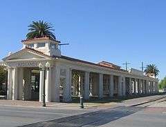 The Pacific Electric Railway completed an interurban connection between Los Angeles and San Bernardino in 1914, providing a convenient, speedy connection to the fast-growing city of Los Angeles and its new port at San Pedro, bringing greater prosperity to the town and a new role as a vacation destination for wealthy Angelenos. Redlands was the eastern terminus of the "Big Red Car" system. At its peak, PE operated five local routes in Redlands, with streetcars running to Smiley Heights, and on Orange, Olive, and Citrus Avenues.[24] Pacific Electric interurban service to Redlands was abandoned on July 20, 1936, with 2.07 miles (3.33 km) of track into the city lifted,[25] although PE and Southern Pacific (parent company of PE) provided freight service as far as the Sunkist packing plant on San Bernardino Avenue[26] into at least the 1970s. The abandoned Pacific Electric La Quinta trestle over the Santa Ana River stands today, immediately south of San Bernardino International Airport.