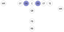 In American and Canadian football, a guard (G) is a player who lines up between the center and the tackles on the offensive line of a football team on the line of scrimmage used primarily for blocking.[1] Right guards (RG) is the term for the guards on the right of the offensive line, while left guards (LG) are on the left side. Guards are to the right or left of the center.