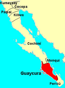 Linguists and archaeologists speculate that the Guaycura and the Pericú occupying the southern tip of the Baja California peninsula may have been the descendants of very early Native American migrants to the Americas. Their languages apparently were not related to each other or any other languages and their physical type was uncommon among Native Americans. They were small-bodied and long-headed (dolichocephalic). Their geographical location was a cul-de-sac in which they may have been isolated from extensive interaction with other peoples. Thus, their unique languages and physical characteristics may have survived for thousands of years. The lack of relationships between Guaycura and other languages indicates that Guaycura may have developed in isolation over a period of at least 5,000 years.[2] At one time the Guaycura and Pericú may have occupied much greater territories but they were pushed southward and isolated by the expansion of the Cochimí people who spoke a language in the Yuman-Cochimí language family.[3]