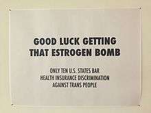 Having been created in the 80’s, it is not surprising that the Guerrilla Girls largely adopted the feminist ideologies of their time. The Guerrilla Girls emerged at the tail end of the second-wave feminist movement, and thus had to navigate the differences between established and emerging feminist theory. “Alma Thomas” describes this grey-area the Guerrilla Girls occupied as “universalist feminism,” bordering on essentialism.[14] Anna Chave claims the Guerrilla Girls’ essentialism was much more profound, leading the group to be “assailed by… a rising generation of women wise in the ways of poststructuralist theory, for [their] putative naiveté and susceptibility to essentialism."[10] This essentialism may be most clearly exhibited in two pieces by the Guerrilla Girls: their 1998 book The Guerrilla Girls Bedside Companion to the History of Western Art and their piece The Estrogen Bomb (2003–13). In regards to the former, “Alma Thomas” explains that “[The Guerrilla Girls Bedside Companion to the History of Western Art] was so embedded in that second-wave feminist and even pre-second-wave essentialism.”[14] Critiques of The Estrogen Bomb for being transmisogynistic have recently been voiced anonymously by students at Minneapolis College of Art and Design.[16][17] Aside from essentialism, the Guerrilla Girls have also been critiqued for failing to integrate intersectionality into their work.[13] However, it is worth noting that the beliefs of the Guerrilla Girls are not monolithic, and individual members have many different understandings of feminism.[14]
