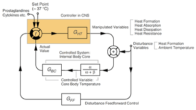 Thermoregulation in both ectotherms and endotherms is controlled mainly by the preoptic area of the anterior hypothalamus.[2] Such homeostatic control is separate from the sensation of temperature.[2]