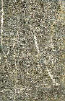 Gwanggaeto's accomplishments are recorded on the Gwanggaeto Stele, erected in 414 at the supposed site of his tomb in Ji'an along the present-day China–North Korea border.[20] Constructed by his son and successor Jangsu, the monument to Gwanggaeto the Great is the largest engraved stele in the world.[21][22]