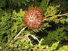 Gymnosporangium juniperi-virginianae is a plant pathogen that causes cedar-apple rust.[1] In virtually any location where apples or crabapples (Malus) and Eastern red-cedar (Juniperus virginiana) coexist, cedar apple rust can be a destructive or disfiguring disease on both the apples and cedars. Quince and hawthorn can substitute for the apples as hosts and many species of juniper can substitute for the Eastern red cedars.