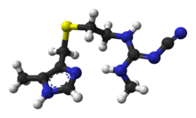 Ball-and-stick model of cimetidine, the prototypical H2-receptor antagonist.
