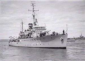 In 1938, the Australian Commonwealth Naval Board (ACNB) identified the need for a general purpose 'local defence vessel' capable of both anti-submarine and mine-warfare duties, while easy to construct and operate.[1][2] The vessel was initially envisaged as having a displacement of approximately 500 tons, a speed of at least 10 knots (19 km/h; 12 mph), and a range of 2,000 nautical miles (3,700 km; 2,300 mi)[3] The opportunity to build a prototype in the place of a cancelled Bar-class boom defence vessel saw the proposed design increased to a 680-ton vessel, with a 15.5 knots (28.7 km/h; 17.8 mph) top speed, and a range of 2,850 nautical miles (5,280 km; 3,280 mi), armed with a 4-inch gun, equipped with asdic, and able to be fitted with either depth charges or minesweeping equipment depending on the planned operations: although closer in size to a sloop than a local defence vessel, the resulting increased capabilities were accepted due to advantages over British-designed mine warfare and anti-submarine vessels.[1][4] Construction of the prototype HMAS Kangaroo did not go ahead, but the plans were retained.[5] The need for locally built 'all-rounder' vessels at the start of World War II saw the "Australian Minesweepers" (designated as such to hide their anti-submarine capability, but popularly referred to as "corvettes") approved in September 1939, with 60 constructed during the course of the war: 36 (including Mildura) ordered by the RAN, 20 ordered by the British Admiralty but manned and commissioned as RAN vessels, and 4 for the Royal Indian Navy.[1][6][7][8][9]