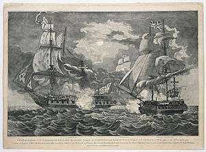 The Action of 13 January 1797 was an engagement off the Penmarks involving the two frigates Indefatigable and Amazon against the French Droits de l'Homme, a 74-gun ship of the line.[25] The battle ended with Droits de l'Homme being driven onto shore in a gale. Amazon also ran onto the shore; still, almost her entire crew survived both the battle and the grounding and were captured. Despite being embayed and having damaged masts and rigging, Indefatigable was able to repair the damage and beat off the lee shore, showing excellent seamanship. She had only 19 officers and men wounded, with most of those not being serious.[25] This action won the Naval General Service Medal with clasp "Indefatigable 13 Jany. 1797" for any crew surviving in 1847.[1]
