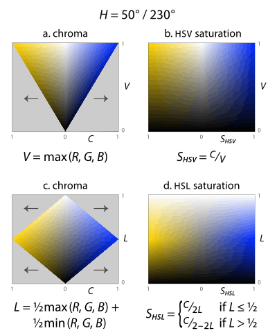 To solve problems such as these, the HSL and HSV models scale the chroma so that it always fits into the range [0, 1] for every combination of hue and lightness or value, calling the new attribute saturation in both cases (fig. 14). To calculate either, simply divide the chroma by the maximum chroma for that value or lightness.