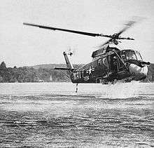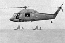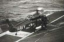The UH-2 began entering operational service in 1962.[3] The Navy soon found the helicopter's capabilities to be restricted by its single engine, and ordered Kaman to retrofit all of its Seasprites with a twin-engine arrangement instead; with two engines the Seasprite was capable of reaching an airspeed of 130 knots and operating at a range of up to 411 nautical miles.[2] The Navy would operate a total fleet of nearly 200 Seasprites for various duties, such as anti-submarine warfare (ASW), search and rescue (SAR) and transportation.[2] Typically, several UH-2s would be deployed upon an aircraft carrier to perform plane guard and SAR missions.[10]