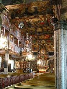 Habo Church (Swedish: Habo kyrka) in Habo Parish, Jönköping County, Sweden, is a wooden church building in Habo. It was built in 1680,[1] and received its present appearance in 1723. The church is unique in its architecture, resembling a cathedral although it is built entirely in wood. It is in the form of a basilica, with a high nave and two lower side aisles. The church is nicknamed the "Wooden Cathedral Near Vättern" (Swedish: Träkatedralen vid Vättern).