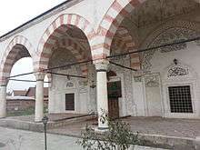 The Hadum Mosque in Gjakova, Kosovo was built in the last decade of the 16th century (1594/95) by the architect Mimar Sinan. Its building was financed by Hadum Sylejman Efendia – Hadum Aga, which explains the name of the mosque. The mosque was built on the property of Jakë Vula and is located in the Old Bazaar. A rectangular, dome-covered structure, it belongs to the classic forms of mosque of the Islamic-Kosovar style. Around the mosque there are tombs with sculpted decorations and engraved with epithets in the old Ottoman language. The tombs belonged to the most respected families in Gjakova. There also used to be a "hamam", but it was destroyed during World War II. The entrances are covered with floral paintings, geometrical shapes, citations from the Qur'an and arabesques. In 1999, the surrounding complex was burned to the ground and only the mosque and the minaret along with some damaged arabesques survived.[1][2][3][4][5]