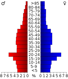 In the town the population was spread out with 28.2% under the age of 18, 8.3% from 18 to 24, 31.7% from 25 to 44, 22.9% from 45 to 64, and 9.0% who were 65 years of age or older. The median age was 35 years. For every 100 females there were 104.9 males. For every 100 females age 18 and over, there were 107.1 males.