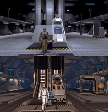 To solve the issues of transferring information from the original game's engine to the Saber engine, the developers looked at how they used the third-party Havok physics engine to handle object positioning, velocities, and collisions. Saber created a proxy of every object in the Halo engine to transfer into the Saber engine, meaning that the game's original programming remained unchanged.[15] The game's ability to alternate between the legacy and remastered graphics engines in the campaign was made possible by the rendering engine developed by Saber Interactive. The technology allowed the developers to update Halo: Combat Evolved's visuals and preserve the original gameplay.[19] Originally, players would have chosen which graphical presentation to play from the main menu.[20] The in-game toggle feature quickly became a talking point among the developers, who pushed for it to be available to other players.[17] Since the ability to switch between classic version and remastered version was provided to players, both engines work simultaneously to retain the spontaneity of game. This approach caused several problems, including collision issues—because objects and environments in the original game were of a lower resolution with fewer polygons, higher-resolution visuals in the Saber engine could deviate from the original significantly. As the original game's geometry was used as the basis for collisions, in some cases characters could appear to walk through or above terrain, weapons could drop through the ground, and bullets would appear to be deflected by nothing. The sheer number of these issues, combined with the desire to keep the original gameplay intact, forced Saber to use a variety of approaches to fix the problems, including making tools for artists to visualize height differences and creating intermediate geometry. In some cases, the artists developed other ways of keeping to the same collision data while updating the visuals by changing the actual object—turning a blocky, low-polygon rock into an angular Forerunner structure avoided the collision issues.[15]