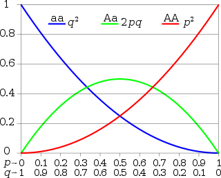 Hardy–Weinberg proportions for two alleles: the horizontal axis shows the two allele frequencies p and q and the vertical axis shows the expected genotype frequencies. Each line shows one of the three possible genotypes.