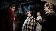The series' first director, Chris Columbus, directing Richard Griffiths, Robbie Coltrane, Fiona Shaw, and Daniel Radcliffe on set of Harry Potter and the Philosopher's Stone.