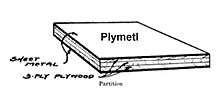 Haskelite Manufacturing Corporation made a plywood consisting of additional layers of metal sheet plating (steel, aluminum, copper) and were branded Plymetl (plywood + metal).[14] Plymetl plywood was used where a strong lightweight material was needed that had a high resistance to impact.[15] It was used in the making of clothes vaults and storage facilities. It was also used in ships, yachts, aircraft and vehicles, especially luxury automobiles.[3] During World War II plywood from the Grand Rapids factory was a major contributor to the war efforts in the construction of military vehicles, combat ships, fighter airplanes, and tanks.[16]