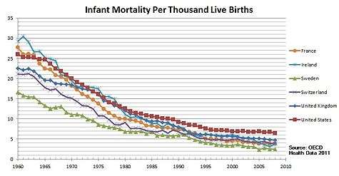 The reduction in infant mortality between 1960 and 2008 for Ireland in comparison with France, Switzerland, Sweden, the United Kingdom, and the United States.
