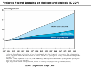 "Future growth in spending per beneficiary for Medicare and Medicaid—the federal government’s major health care programs—will be the most important determinant of long-term trends in federal spending. Changing those programs in ways that reduce the growth of costs—which will be difficult, in part because of the complexity of health policy choices—is ultimately the nation’s central long-term challenge in setting federal fiscal policy...total federal Medicare and Medicaid outlays will rise from 4 percent of GDP in 2007 to 12 percent in 2050 and 19 percent in 2082—which, as a share of the economy, is roughly equivalent to the total amount that the federal government spends today. The bulk of that projected increase in health care spending reflects higher costs per beneficiary rather than an increase in the number of beneficiaries associated with an aging population."