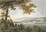 Heanton Court, the former manor house of the Manor of Heanton Punchardon, is a grade II listed building[6] situated on the north shore-line of the River Taw estuary, about a mile south-east of the parish church. Rev. John Swete described the house in spring 1796 as "the seat of Col. Basset" and wrote of it that "The house exhibits itself handsomely though its situation (like that of Lord Heathfield's on the Exe [i.e. Nutwell]) seems to be too contiguous to the water. Nearly opposite to it was a large track of marsh and sand..." He later made a copy of a painting by William Payne, c. 1790,[lower-alpha 2][7] The house as painted by Swete in about 1797 is essentially as it survives today, retaining its battlements and corner towers. It is currently used as a public house and hotel, known in 2015 as the Braunton Inn.