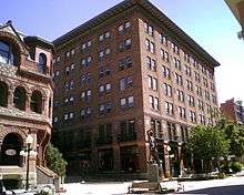 Helena's early commercial district was located along State, Edwards, and Broadway Streets, but fires destroyed much of this area in 1869, 1872, and 1874. Much of what was built afterwards was built in the Western Commercial style, with splendid brickwork and simple lines. The Beaux Arts Parchen Drug Building, Colwell Building, and the Penn-Block Bristol Hotel were French Renaissance. The Denver Block and Sands Brothers Dry Goods were Romanesque Revival.[3] By the mid-1880s at least 18 architectural firms had been established in Helena or called in from back East. Several of these architects were part of or influenced by the Chicago school of architecture. This influence is seen in the Atlas Building, Securities Building, Power Block, and the Lewis and Clark County Courthouse.[5]