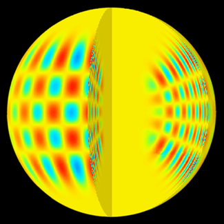 The simplest modes to analyse are the radial ones; however most solar modes are non-radial. A nonradial mode is characterized by three wavenumbers: the spherical-harmonic degree and azimuthal order which determine the behaviour of the mode over the surface of the star and the radial order which reflects the properties in the radial direction (see the diagram on the top right for an example). Note that if the Sun were spherically symmetric, the azimuthal order would exhibit degeneracy; however the rotation of the Sun (along with other perturbations), which leads to an equatorial bulge, lifts this degeneracy. By convention, corresponds to the number of nodes of the radial eigenfunction, indicates the total number of nodal lines on spheres, and tells how many of these nodal lines cross the equator.